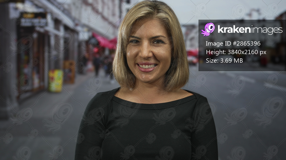 Woman smiles with bare mouth and visible teeth on a busy city street with blurred buildings and sidewalk; happiness.