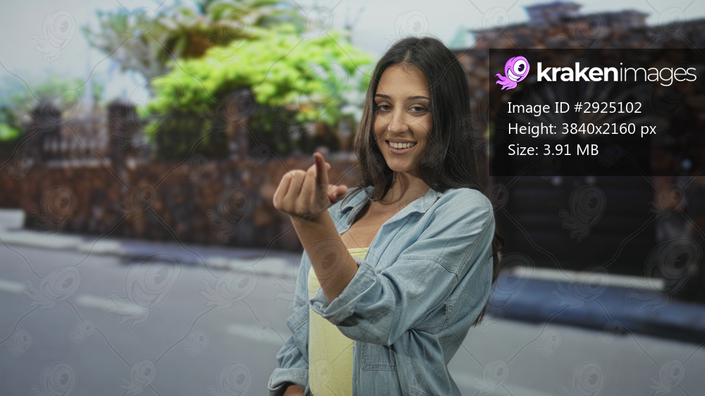 Woman smiles and beckons with hand at house street entrance wearing denim shirt and yellow top, casual pose; invitation warmth.