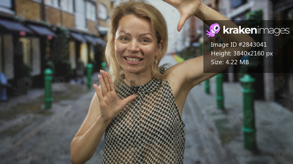 Woman smiles broadly and frames a colorful brick shopfront with both slender hands while walking down a narrow cobblestone street; happiness.