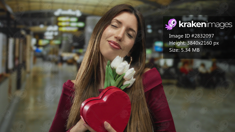 Woman smiles gently holding red heart box and white tulips at busy airport terminal; romantic anticipation.
