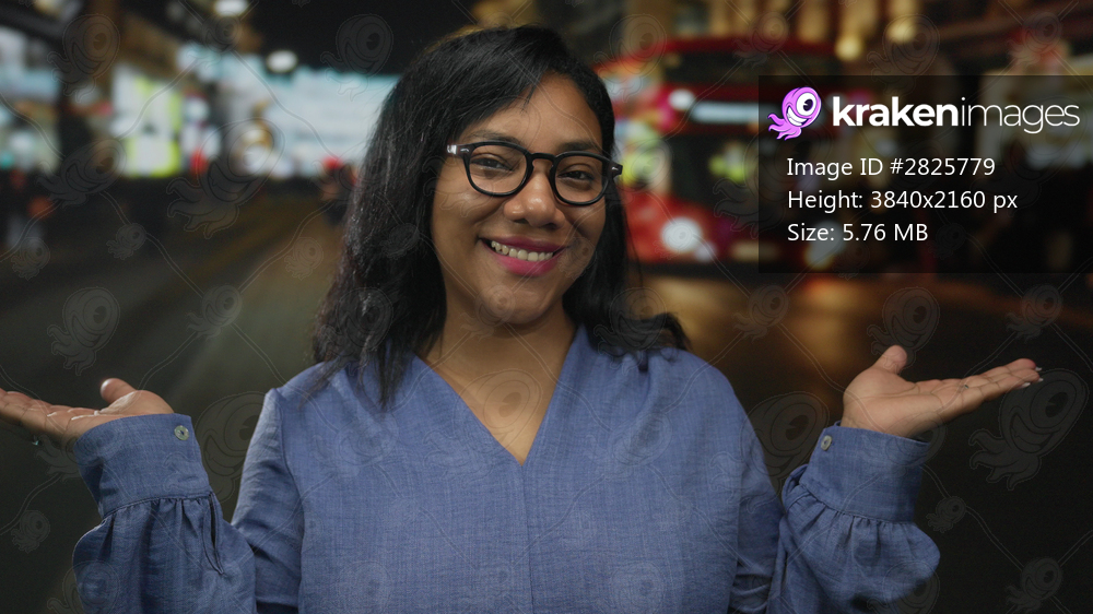 Woman smiles and gestures with open palms on busy neon lit city street lined with storefronts at night; uncertainty.