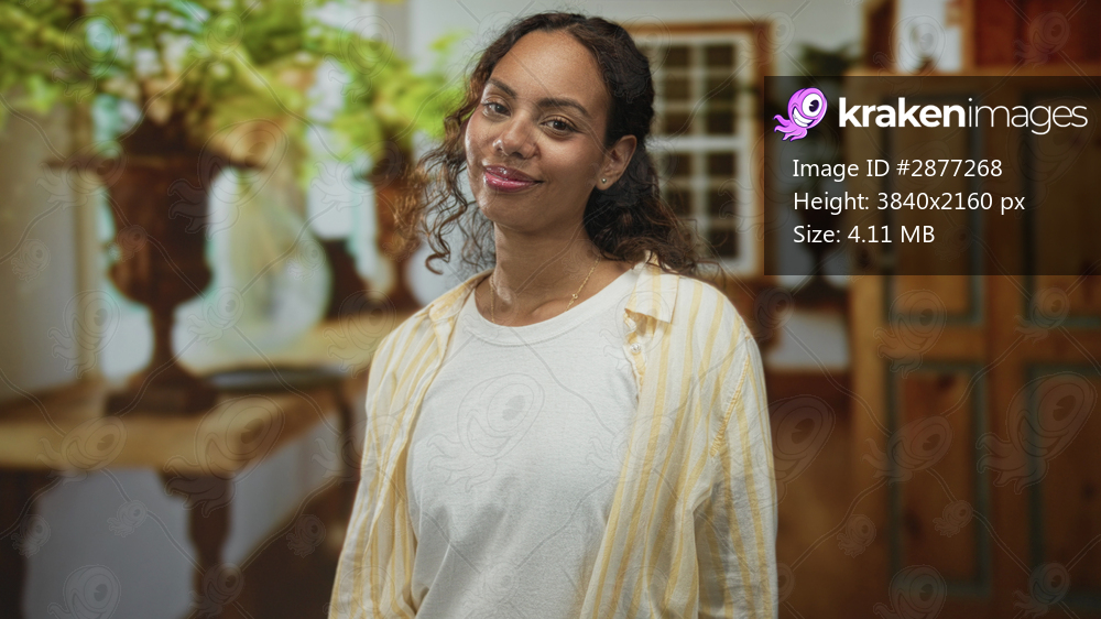 Woman smiles with hand on chest wearing a striped shirt in a living room building, head tilted and eyes soft; quiet gratitude.