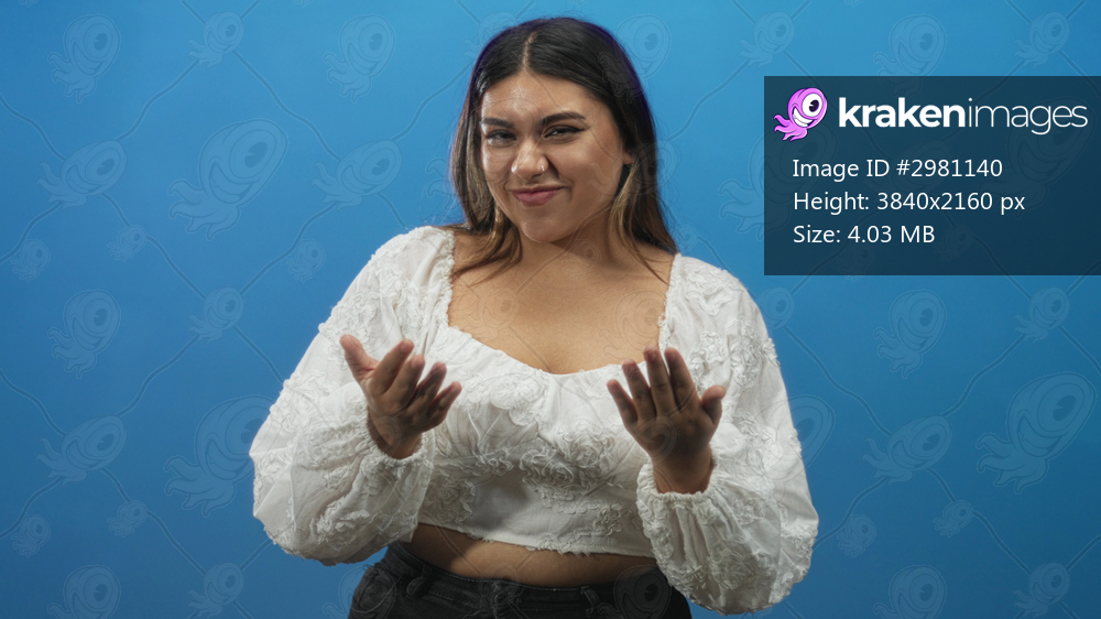 Woman smiles with hand on hip and midriff exposed in blue studio, head tilt and playful fist gestures; confidence empowerment.