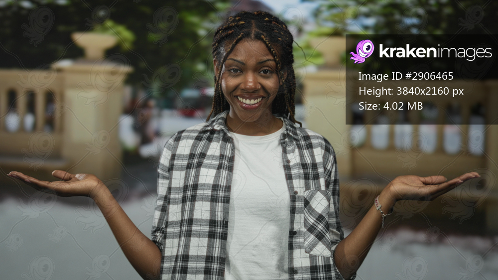 Woman smiles holding palms up in street near stone balustrade and trees, wearing plaid shirt and white tee; playful contemplation.