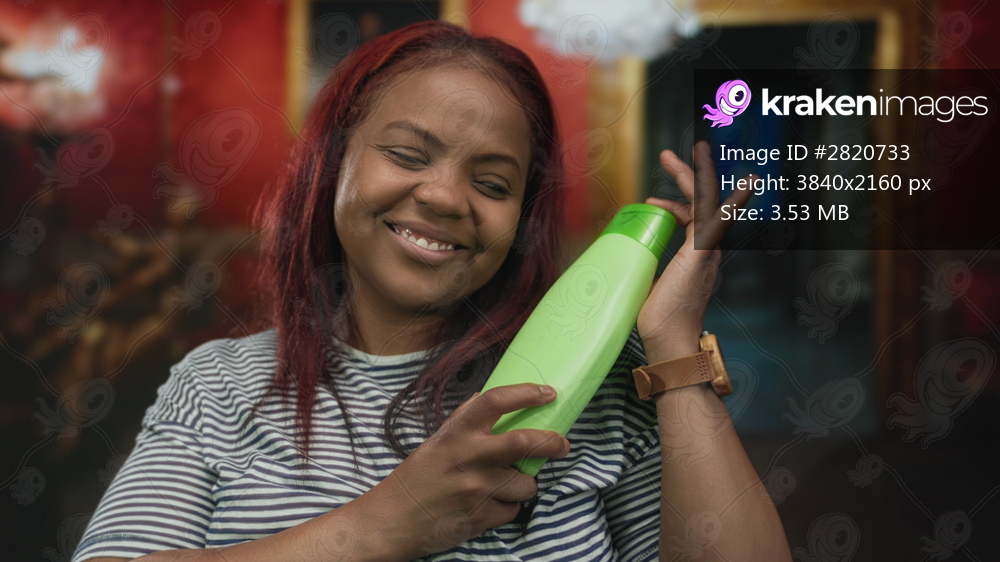 Woman smiles and holds a large bright green bottle gently with both hands in historic museum; happiness.