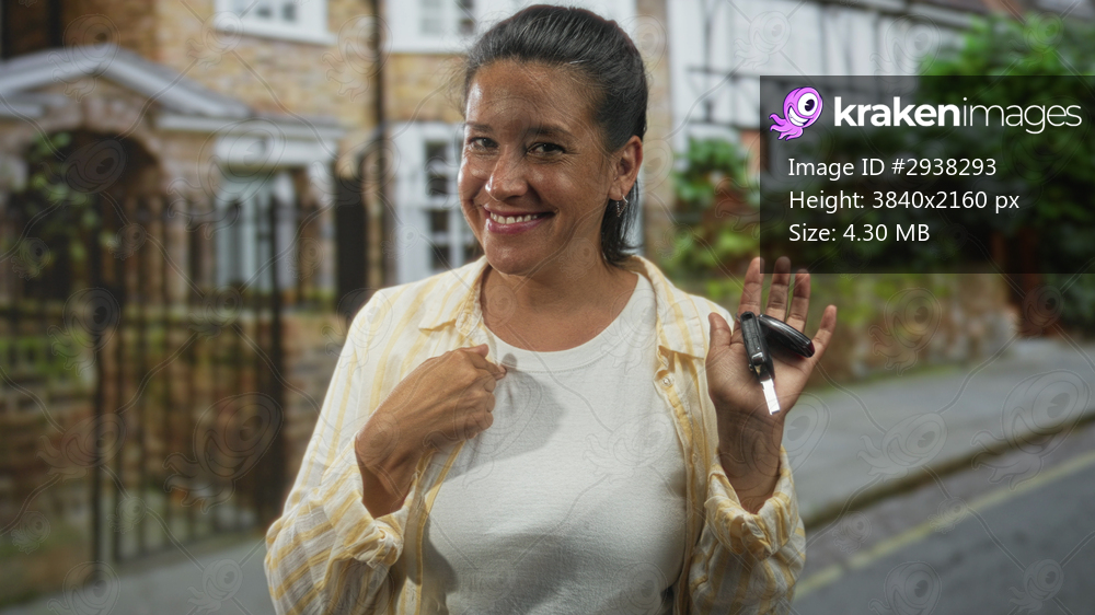 Woman smiles, holds car keys and points to chest while standing on a street in front of a brick house and iron gate; pride ownership.
