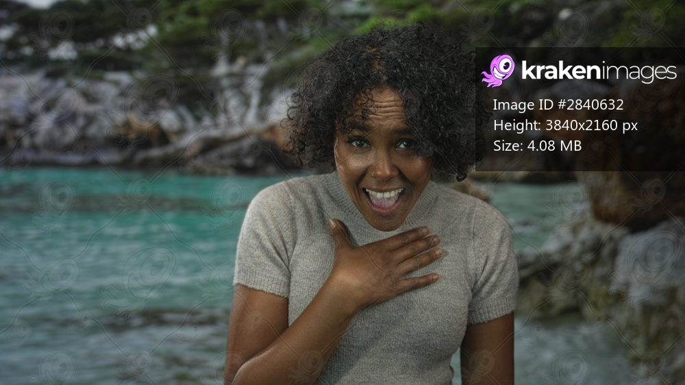 Woman smiles and holds hand on chest in natural forest setting while looking at camera with relaxed posture; joy.