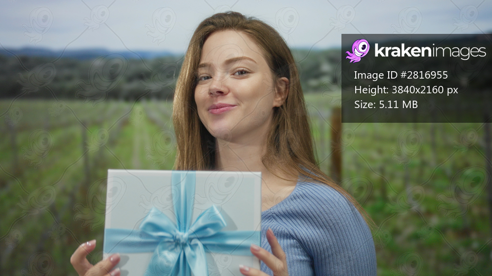 Woman smiles and holds wrapped gift box with blue ribbon in green vineyard outdoors; celebration anticipation joy.