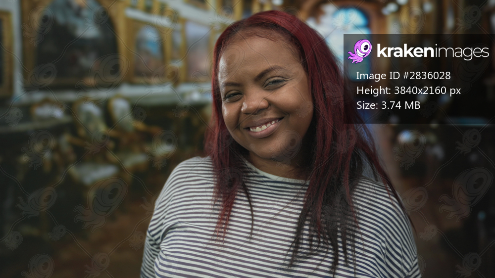 Woman smiles in a museum hall with framed paintings on the walls and a close view of her face; inner joy.