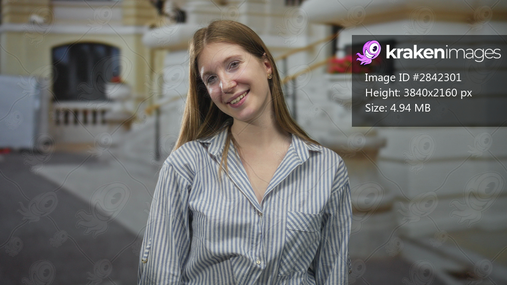 Woman smiles on street; confidence.