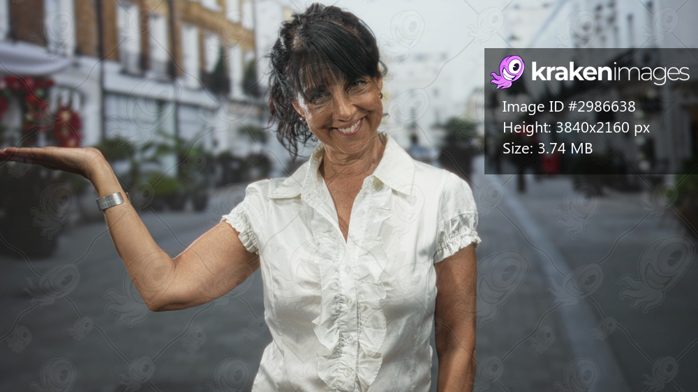 Woman smiles with palm up gesture on a pedestrian street wearing white blouse and wristwatch; joy confidence.