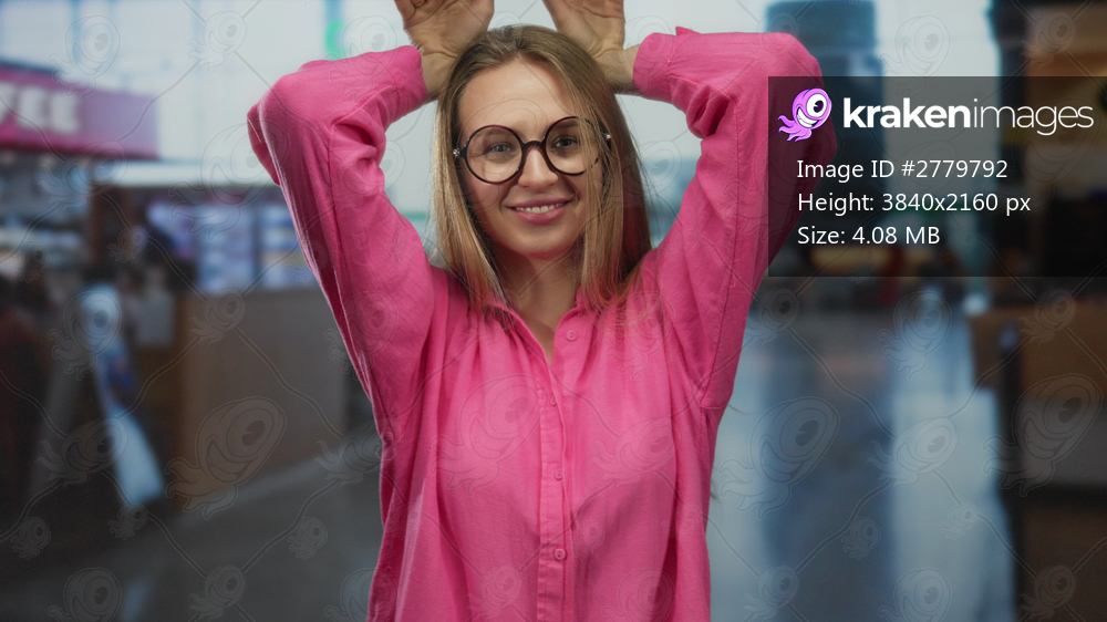 Woman smiles playfully with hands on head in airport wearing pink shirt and glasses while standing indoors surrounded by blurred airport background.