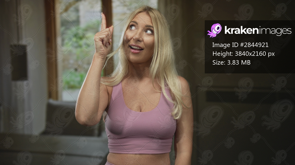 Woman smiles and points finger to ceiling over bare chest in building; idea thought inspiration curiosity.