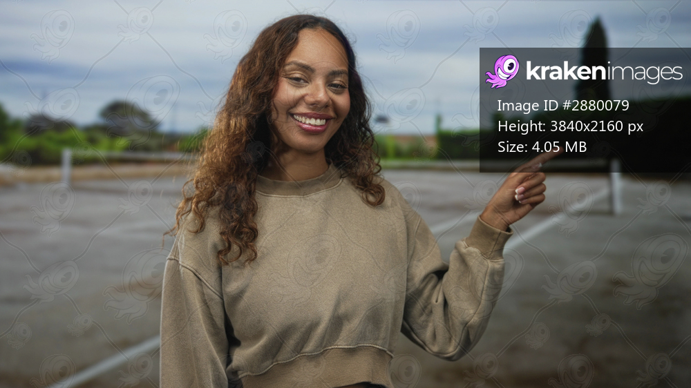 Woman smiles and points finger to right on a tennis court outdoors in a beige sweatshirt; joyful invitation.