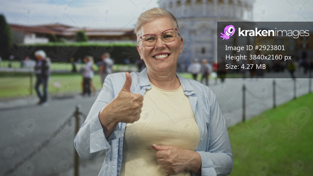 Woman smiles and presents palms up with thumbs up gesture in front of pisa tower building; joy travel memory.