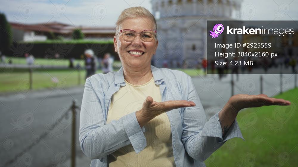 Woman smiles and presents palms up with thumbs up gesture in front of pisa tower building; joy travel memory.