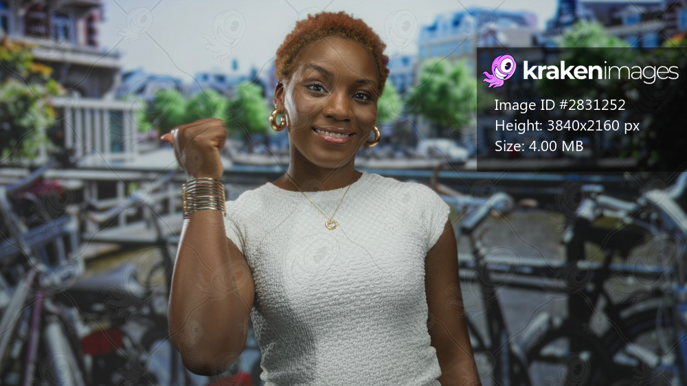 Woman smiles and raises clenched fist with bare arm by canal on street; confidence empowerment growth pride.