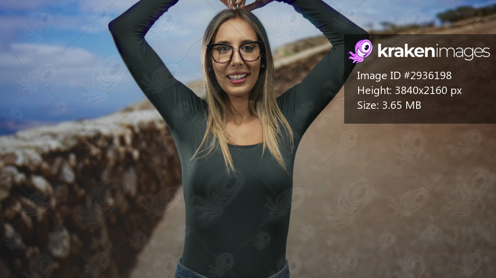 Woman smiles and raises hands forming a heart above head on a rocky outdoor street wearing glasses and long blonde hair; playful happiness.