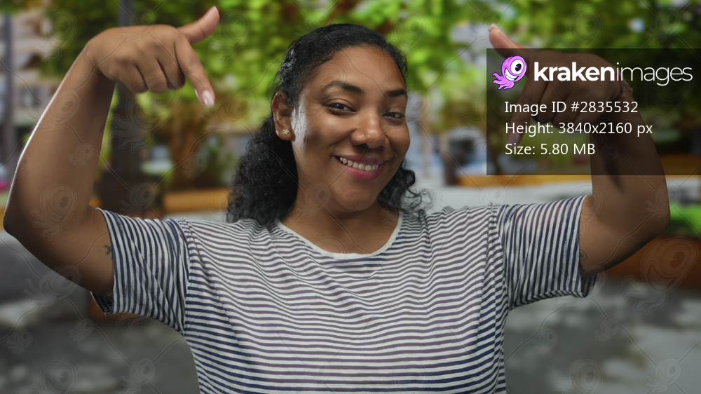 Woman smiles showing her face and points both fingers downward in a sunlit park with green foliage; happiness.