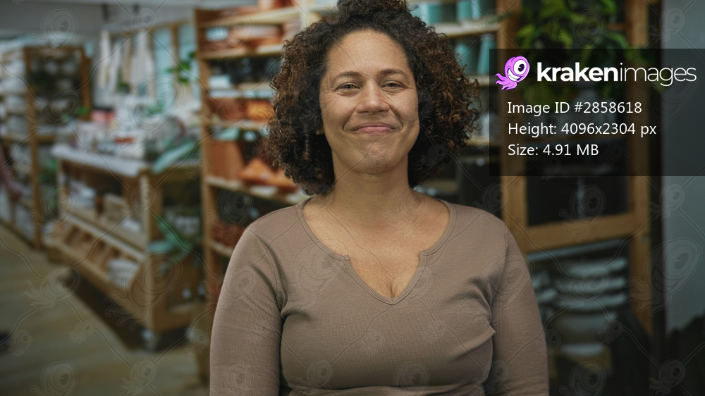 Woman smiles showing neckline in modern indoor decor store; home comfort warmth.