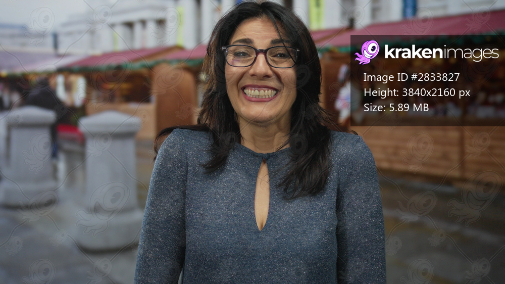 Woman smiles showing teeth and wearing glasses at bustling street market souvenir stalls under overcast sky; happiness.