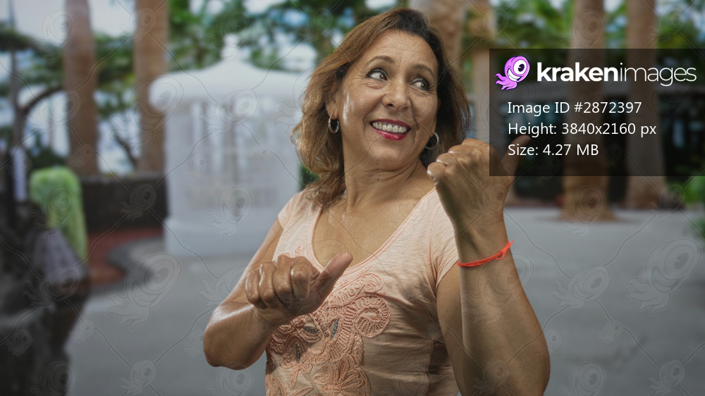 Woman smiles and shows thumbs up with hand amid palm trees in green forest wearing a coral top; confidence.