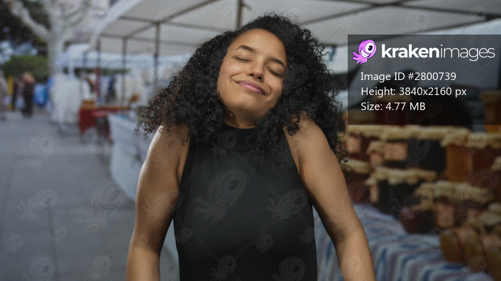 Woman smiles and stretches arms behind head beside stacked jam jars on sunlit street market stall; carefree happiness.