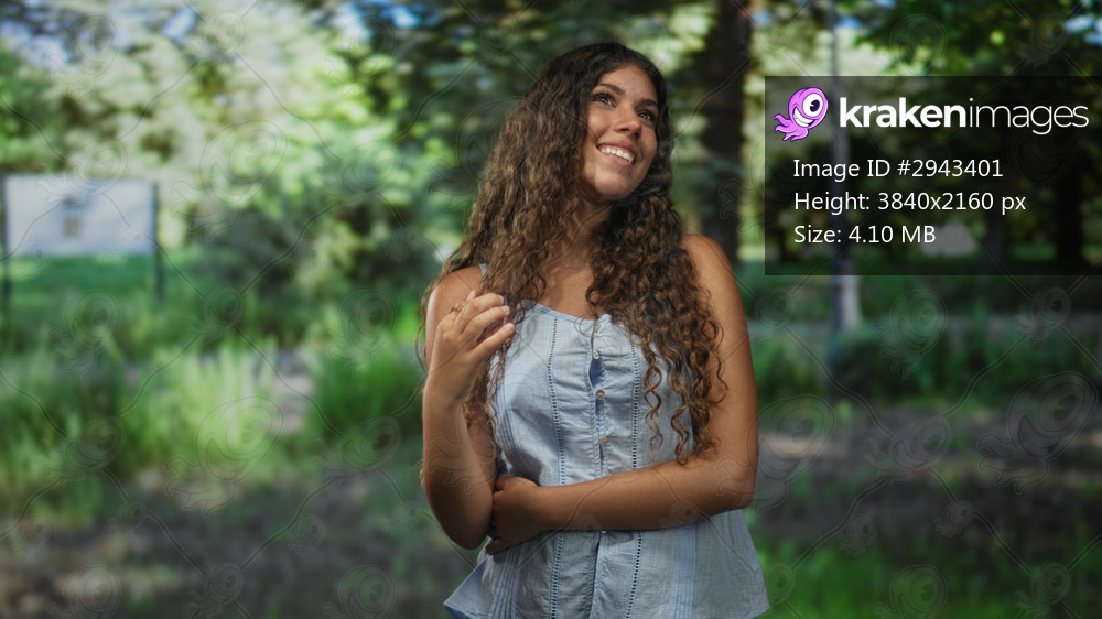 Woman smiles and twirls curly hair with fingers while wearing blue denim top in sunlit park; carefree playful moment.
