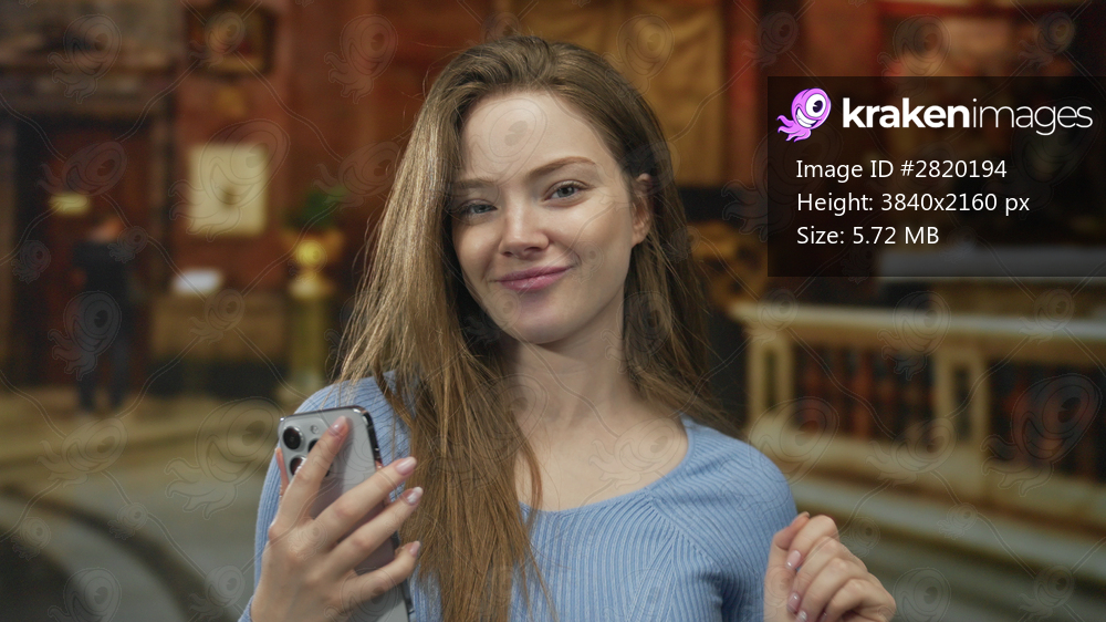 Woman smiles with visible face and holds smartphone by large wooden altar in church; serenity reflection.