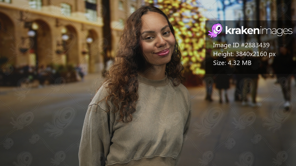 Woman smiles with visible face and slight head tilt on busy city street beside lit holiday tree and blurred crowd; joy confidence.
