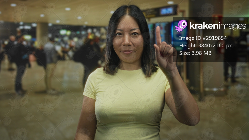 Woman smiles and waves hand in crowded airport terminal showing palm and bracelet near information screens; friendly greeting travel.