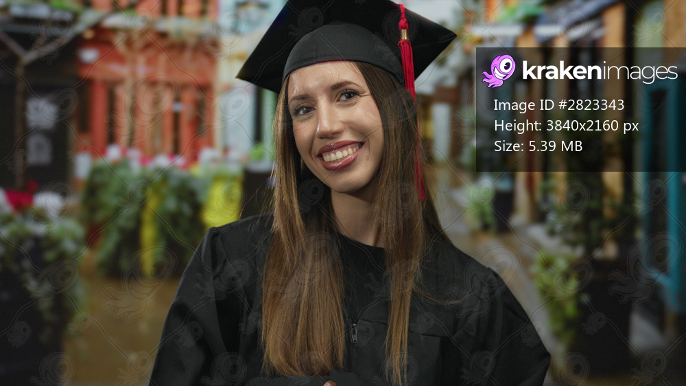 Woman smiles wearing graduation cap and gown with red tassel on sunlit city street; academic achievement pride.