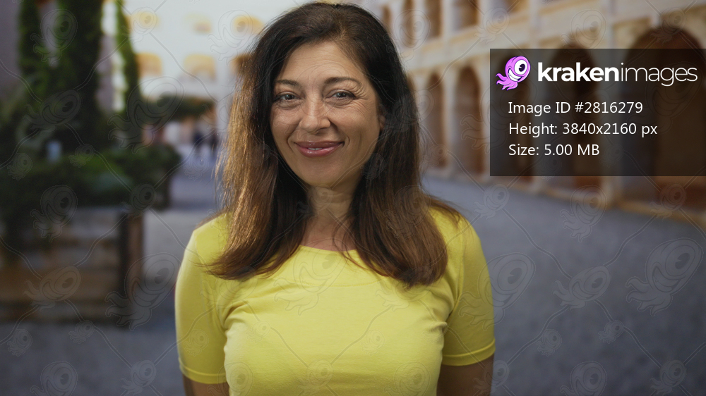 Woman smiles wearing yellow shirt standing on old town street lined by historic stone arches; happiness.