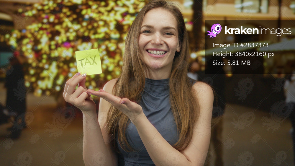 Woman smiles while holding a tax note on a bustling city street lit by festive lights; tax planning optimism.