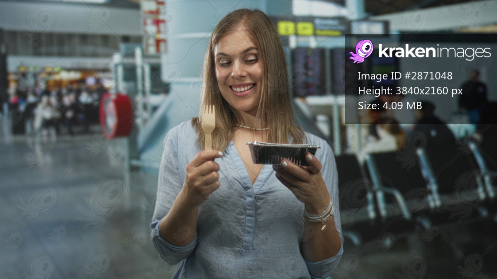 Woman smiles while holding a wooden fork and plastic container of food in airport terminal; satisfaction.