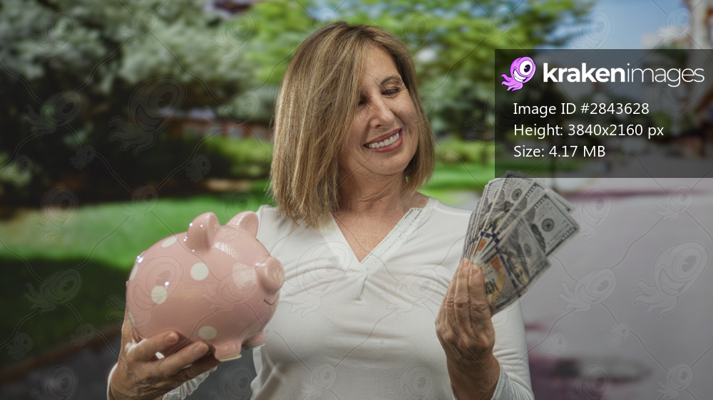 Woman smiles while holding piggy bank and fanning money in a green park; financial security confidence.