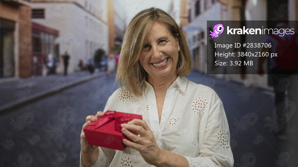 Woman smiles while holding red gift box with hands on busy street; generosity gratitude celebration happiness.