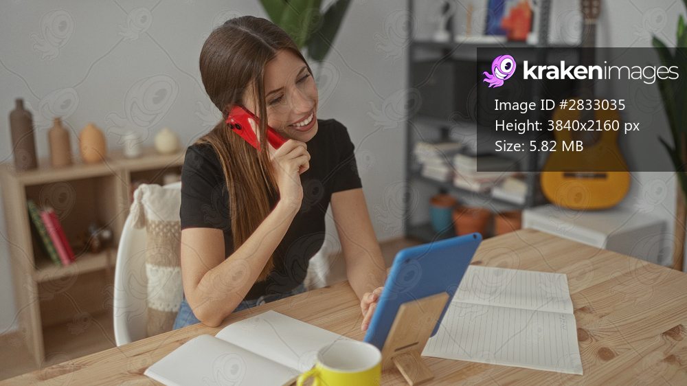 Woman smiles while holding smartphone to ear and typing on tablet with notebook and mug inside a modern building; happiness.