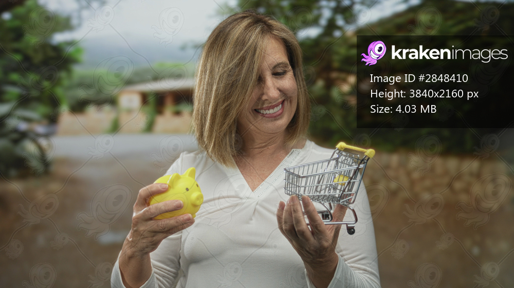 Woman smiles while holding yellow piggy bank and miniature shopping cart in hands outdoors; frugality.