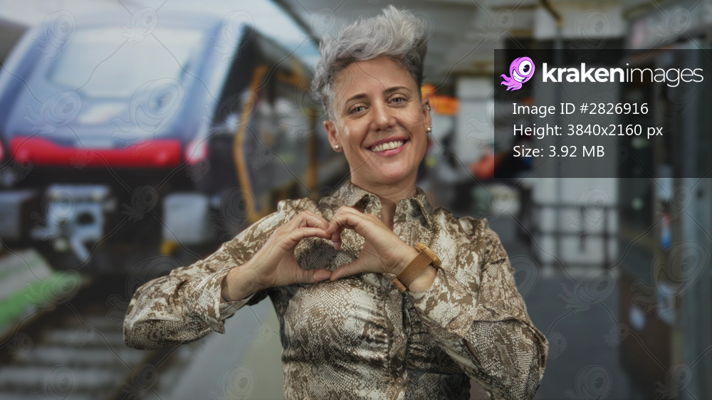 Woman smiles while making heart gesture with hands in front of a red train at railway building; joy.