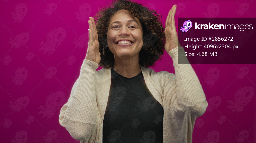 Woman smiles widely and frames her face with both hands against a vibrant pink studio wall; joy playfulness warmth.