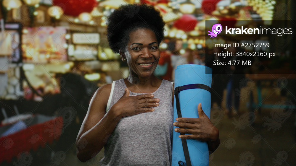 Woman smiling with a yoga mat on a busy city street, wearing casual attire, creating an outdoor vibe that captures urban life with a joyful expression. - Kraken Images