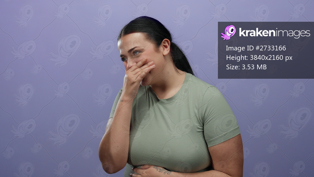 Woman smiling against a purple background, showcasing confidence and positivity, with her plus size figure highlighted by a casual green shirt that complements the isolated setting. - Kraken Images