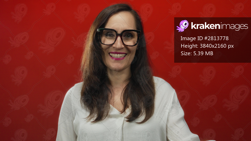 Woman smiling against a vibrant red background wearing glasses, with her long dark hair and white shirt creating a modern and confident portrait of a young hispanic female. - Kraken Images