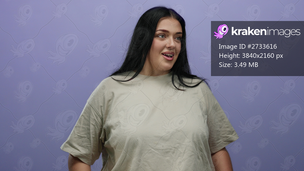 Woman smiling against purple background with long black hair and plus-size figure, capturing confidence and joy.