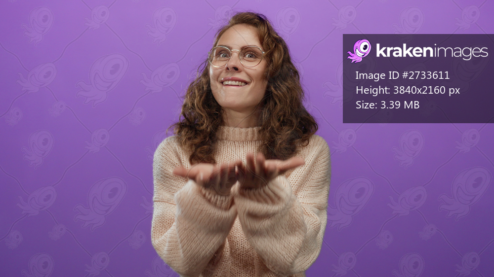 Woman smiling against purple background wearing glasses and sweater, showcasing cheerful expression of joy and warmth with vibrant color contrast in studio setting. - Kraken Images