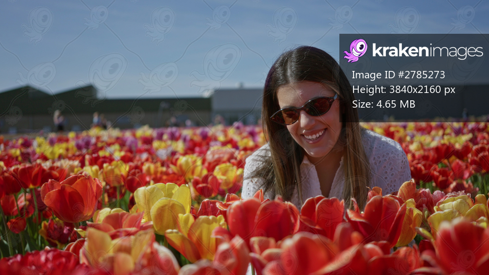 Woman smiling among vibrant tulips in lisse, netherlands, showcasing a joyful moment immersed in nature with colorful flowers surrounding her.