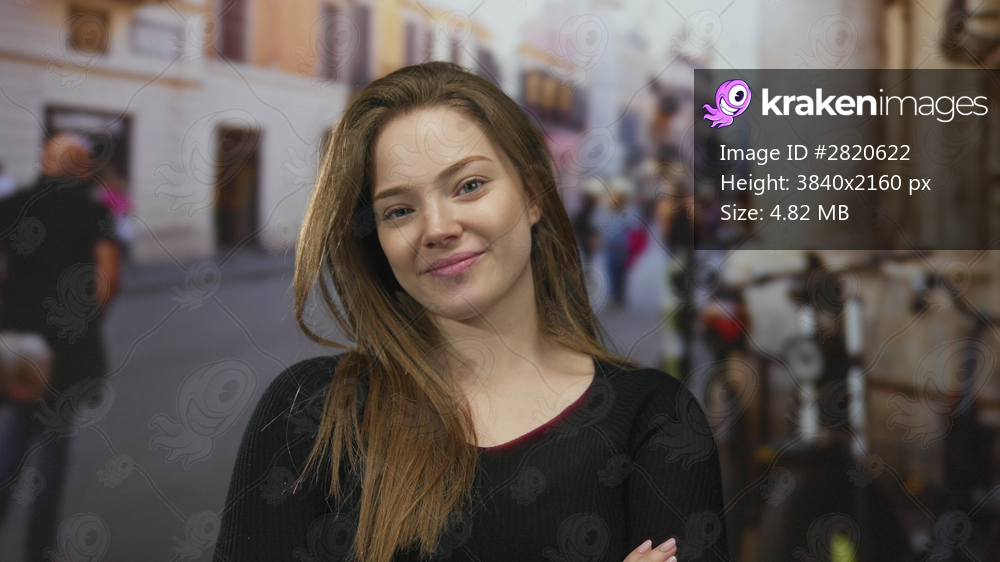 Woman smiling with arms crossed and a slight head tilt on a busy city street with blurred pedestrians; rejection.