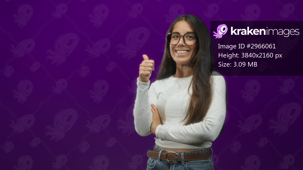 Woman smiling with arms crossed and giving a thumbs up gesture against a purple studio backdrop; confidence.