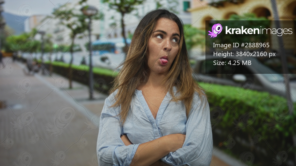 Woman smiling with arms crossed and hair blowing, wearing light blue blouse, standing on a tree lined city street with parked cars; confidence urban casual. - Kraken Images